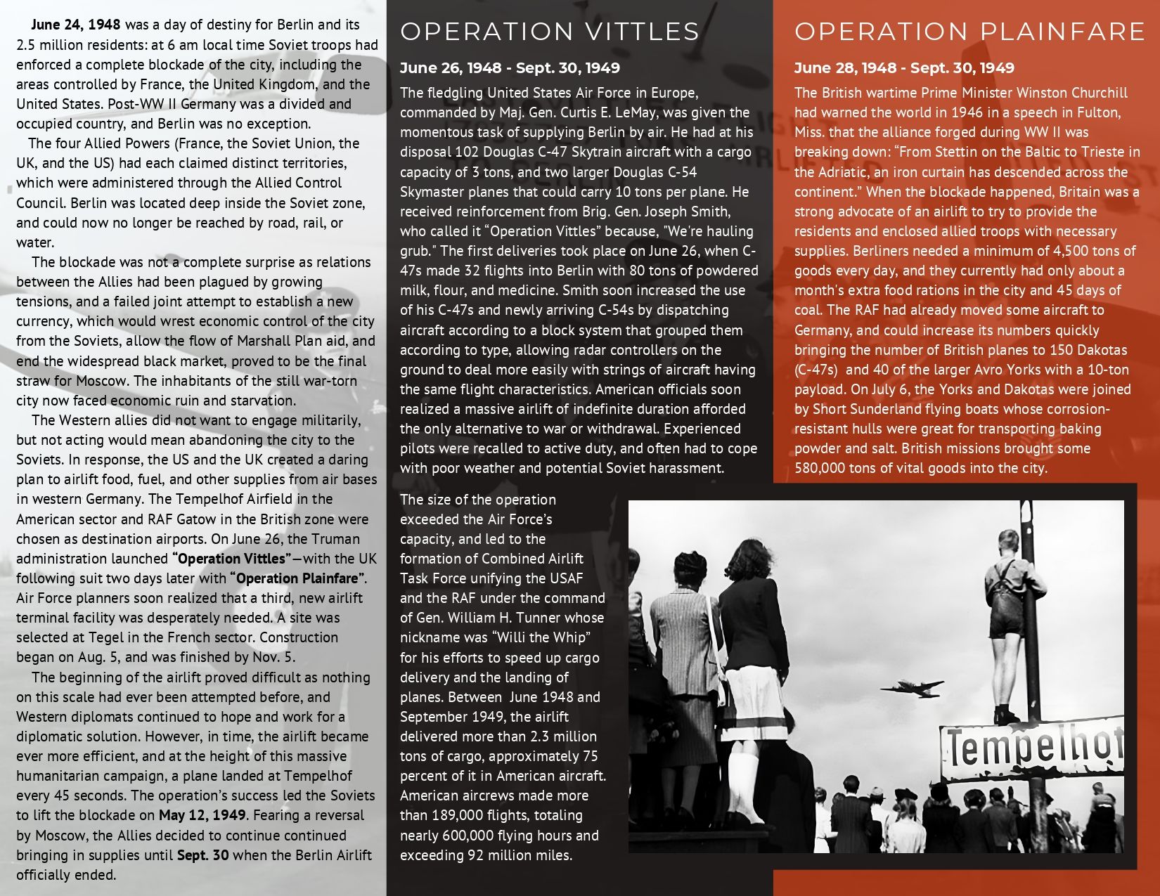 When dawn broke in Berlin, Germany on June 24, 1948, the outside temperature was cool enough to keep people snuggled into their beds and blankets. At 6 o’clock local time that morning, Soviet troops had enforced a complete blockade of the city and its inhabitants, including the areas controlled by Western allies. Berliners and Allied troops alike awoke in a place that was akin to an open-air prison: an area that was completely closed off, and could no longer be reached by road, rail, or water.